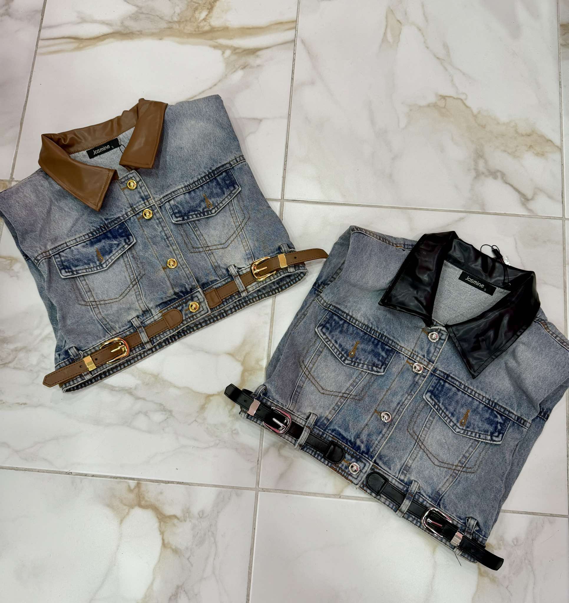 new smanicato di jeans con dettagli in pelle